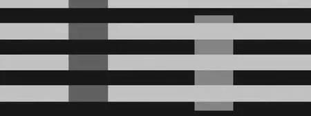 看来,人们常说的“眼见为实”也不靠谱。接下来我们看几个由于“侧抑制”引发的错觉。什么是“侧抑制”呢?生理学上讲,视网膜上的神经细胞受到光刺激的同时,会对周围的神经细胞产生抑制作用,这种现象就叫为“侧抑制”。它发生在视网膜上一种叫做侧细胞丛的结构上。理解没?若是没理解,通俗讲就是被亮的区域包围的区域显得暗些,而被暗一些的区域包围的区域显得亮些。图9是著名的赫尔曼栅格错觉,在白色栅格的十字交叉处我们能隐约感觉到有暗灰圆点在闪现。这是因为在十字交叉处的四边都是亮的区域,而白栅格只是两侧,所以注视交叉处的视网膜区域比注视白栅格的区域受到了更多的抑制,就显得比其它区域暗一些,于是在交叉处看到灰点。图10左右两灰色竖条块的灰度是一样的,但看上去左边的颜色要深于右边, 这也是“侧抑制”的因素导致的。