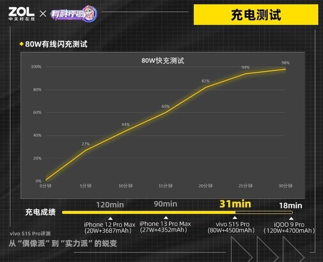根据实际测试,vivo S15 Pro从0~100%共计耗时31分钟,15分钟就能充入60%的电量,完全具备“快速回血”的实力。虽然比起一些百瓦以上的快充“卷王”慢了一些,但对于普通用户而言,这个速度平时利用零星时间给手机快速回个血还是完全够用的。