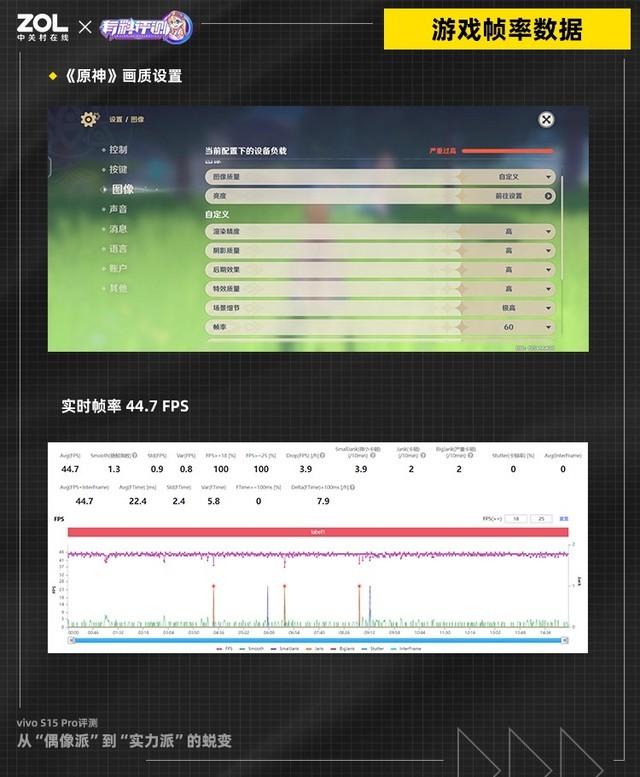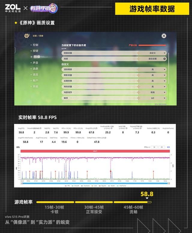 跑完分,我们就来看看vivo S15 Pro在游戏中的实际表现,看看双芯加持的vivo S15 Pro会有怎样的表现,我们依旧是选择目前市面上三款主流游戏:王者、吃鸡以及原神进行测试,测试结果如下: