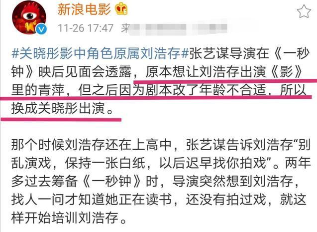 就在张导为宣传新签下的刘浩存时,也不忘隔空拉来关晓彤,称她在《影》中饰演的举伞美人一角,本来定好的是刘浩存。