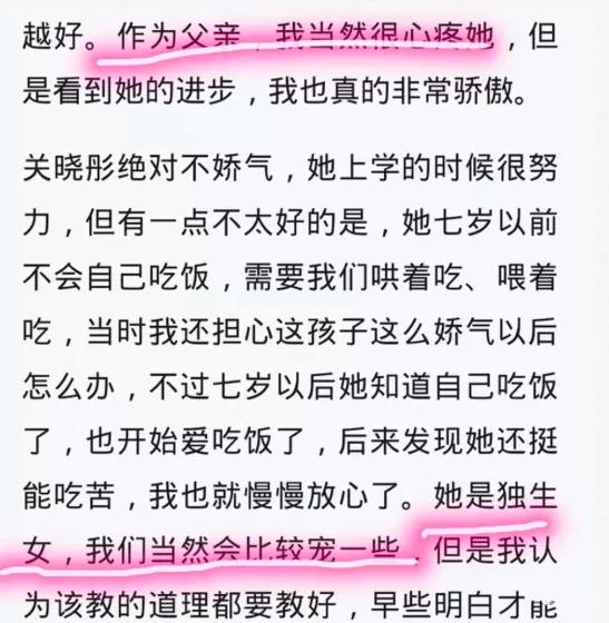 但不知是关爸爸年纪大了记忆开始混乱,还是爱关晓彤这个小女儿爱得过了头,只见他写道:“关晓彤是独生女,当然会比较宠一些。”