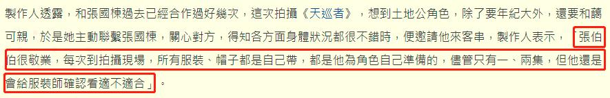 据《天巡者》的制片人透露,张国栋在拍摄现场非常敬业,服装、帽子都是自己带的,尽管戏份不多,但他还是会很认真地准备。