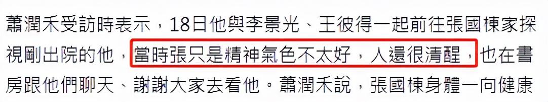 而萧润禾去张国栋家中探望的时间是10月18日,距今不过半个月而已。当时张国栋的精神气色就已经不太好了,但人还是清醒状态,聊天也很正常。