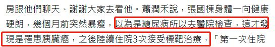 据萧润禾称,好友虽然年事已高,但身体一向健康硬朗,然而在几个月前,张国栋却突然暴瘦,本以为是患上了糖尿病,去医院检查后确诊为胰腺癌。