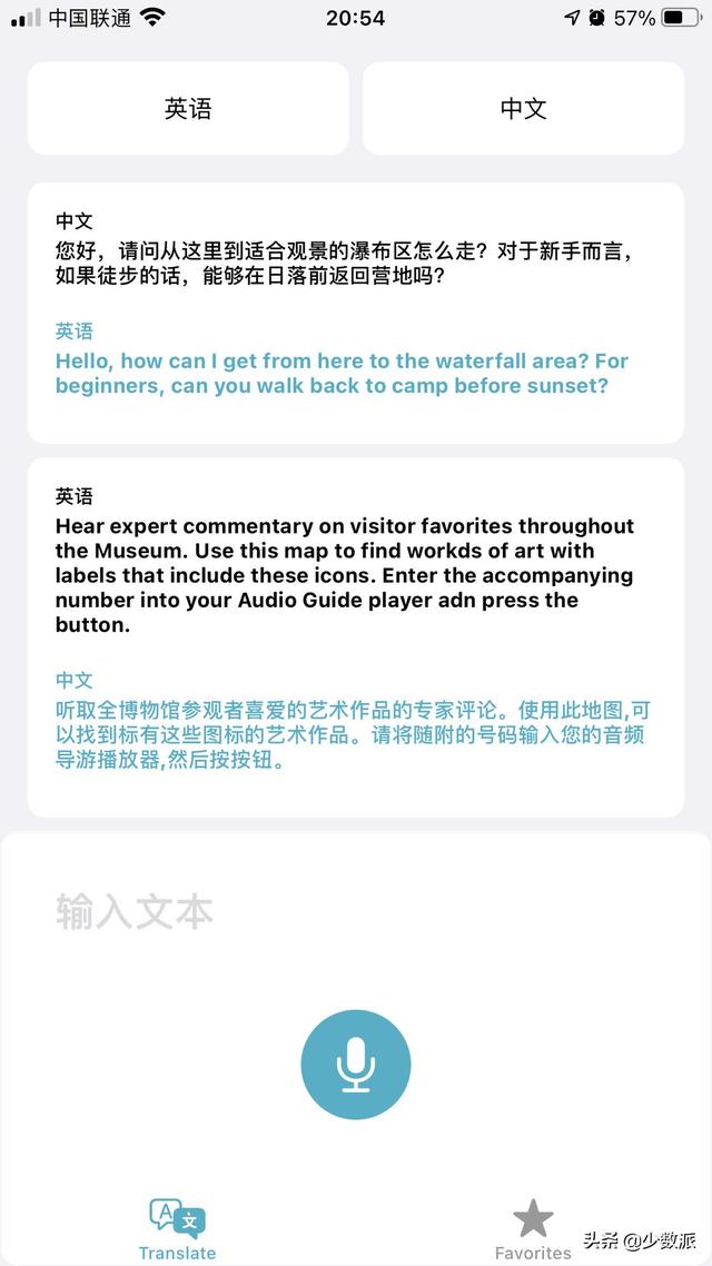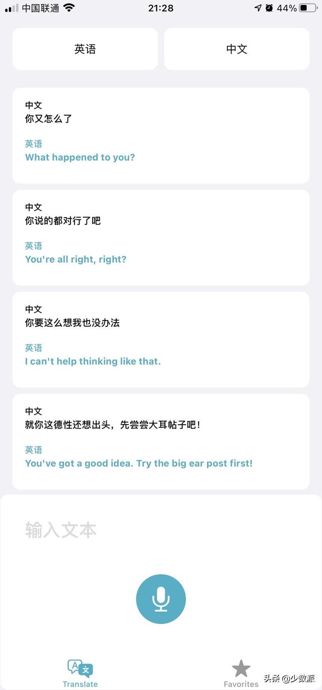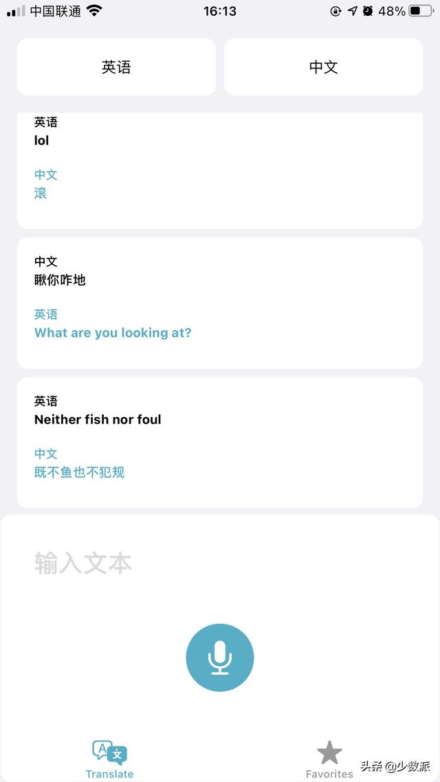 其它功能除了文字输入以外,翻译应用还提供了语音输入的功能。经过测试,语言输入的准确度,达到 80%,可参考 Siri 对语音识别的准确度。也就是说,使用语音输入,