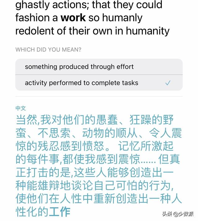在进行中译英的测试时,出现了一个比翻译缺失还要严重的问题,就是翻译成句语法不正确 6 。而英译中的测试,完成度相对较高,语意和情绪都能够得到传达,尽管句子结构略显拖泥带水。值得注意的是,对于一词多义的情况,应用给出了根据被译语言解释的选项,来更好地达到准确的效果。这一功能显然是有帮助的。
