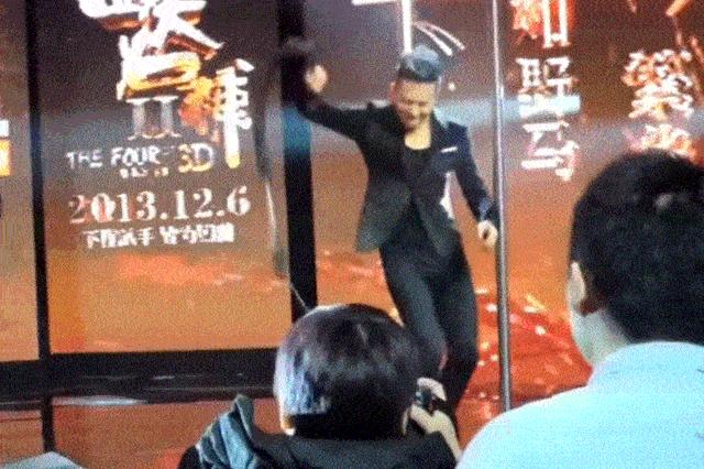 在发布会现场,邓超直接拿着小皮鞭跳起了钢管舞。