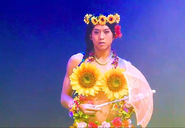 他先是穿着向日葵和草裙给大家来了一场“沙滩风”走秀。