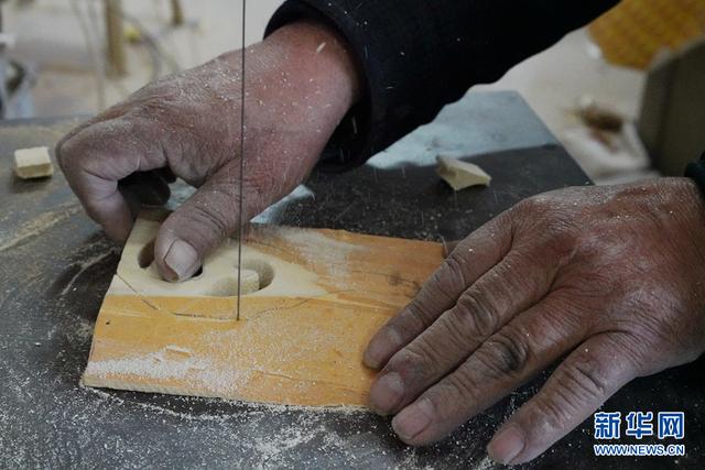 杨增贵正在木料按照画好的样式锯成型。新华网 卡娅梅朵 摄