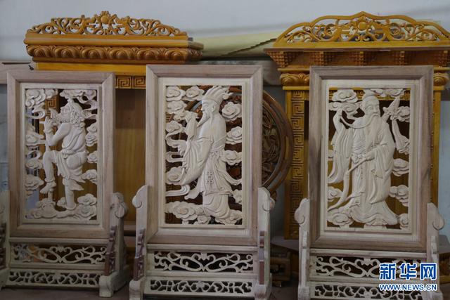工作室内摆放着雕刻完成的湟源排灯半成品。新华网发