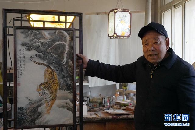 杨增贵正在展示为虎年制作的湟源排灯。新华网 卡娅梅朵 摄