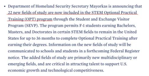 但是,现在新增了22类专业/研究领域都可以将OPT延至36个月!也就是说非STEM学科留学生也可以享受优待。