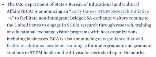 允许持有J-1签证的STEM学术人员毕业后在相关领域工作36个月。