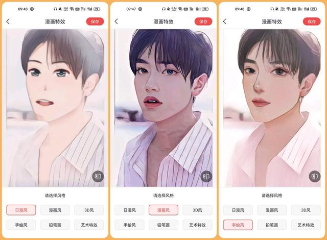 可以看到菜单栏分别有:日漫风、漫画风、3D风、手绘风、铅笔风、艺术特效等六大风格类型。每一个都各有特色,接下来给大家演示的是日漫风、漫画风以及手绘风的效果图。