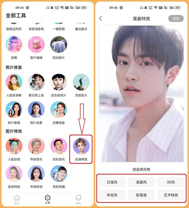 接着,我们选择下方菜单工具——图片特效——动漫特效——上传照片——选择动漫风格,这样你就得到了一份属于自己的漫画头像哦!