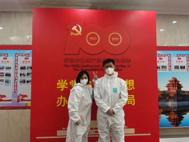 这次对接的是展览路街道百万庄东北京市税务局核酸检测点,检测地点安排在室内。一走进室内,便看到了醒目的建党百年庆祝活动标识。我和同来支援的同事相互整理检查穿着隔离衣的“仪容仪表”便满怀期待地开始了第一次核酸信息登记工作。