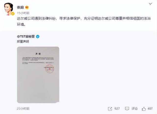 面对这种情况,5月27日,张庭、林瑞阳通过公司账号发布了声明,辟谣了反告市监局的台媒报道,并称相信祖国的法治环境。