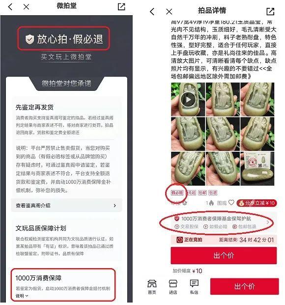“微拍堂”APP的“1000万消费保障”“放心拍,假必退”“假必赔”等相关承诺页面截图。资料图片