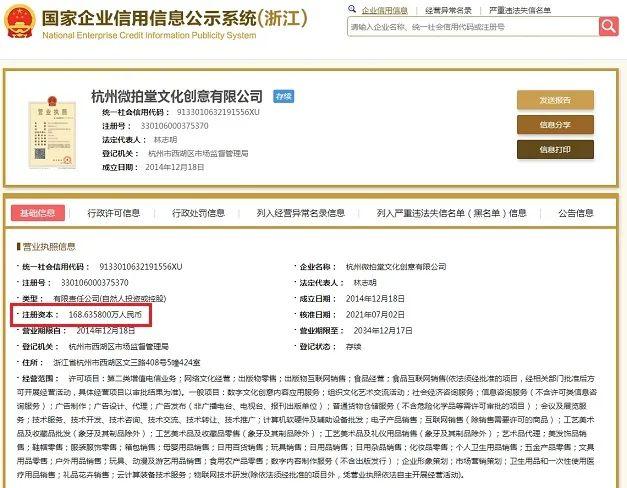 国家企业信用信息公示系统显示杭州微拍堂文化创意有限公司注册资金为168万元。资料图片