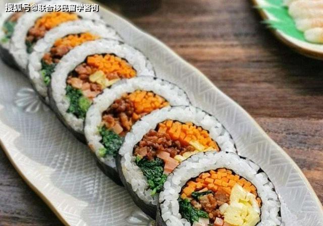 在紫菜上放上一层米饭后加入胡萝卜等其他材料后卷好,做起来简单,吃起来方便,很受欢迎,拥有多种口味。