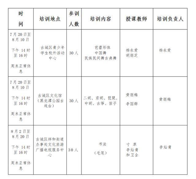 据了解,此次培训为公益免费培训,培训内容以舞蹈、纳西古乐、书法为主,主要面向古城区范围内青少年招生。
