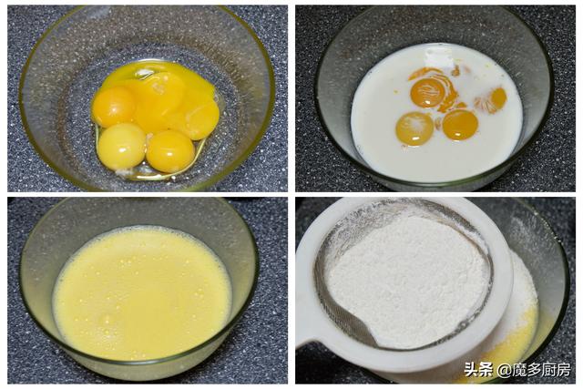 2、先将鸡蛋分离成蛋黄和蛋清,分别放进两个无油无水干燥的大碗或小盆里,蛋黄里加入纯牛奶,用手动打蛋器搅拌均匀,再将低筋面粉过筛进牛奶蛋黄糊里;