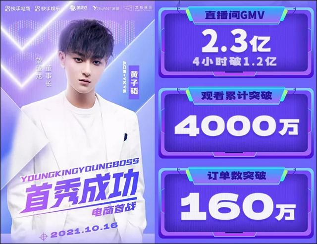 10月16日,黄子韬首次在快手开启直播带货,首秀GMV就达到2.3亿,成绩亮眼,在直播共上架了131个商品,其中美妆护肤类和珠宝钟表类的商品销售额最高。黄子韬在快手的直播首秀热度居高不下,一度冲上微博热搜榜。