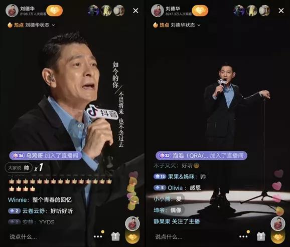 而就在他入驻抖音半年后,刘德华又于7月29日开启了直播首秀,单场直播时长近3小时,直播间累计观看人次超过1亿;同时最高在线人数近400万,直播间点赞高达9.6亿;直播结束后,账号新增粉丝426万。