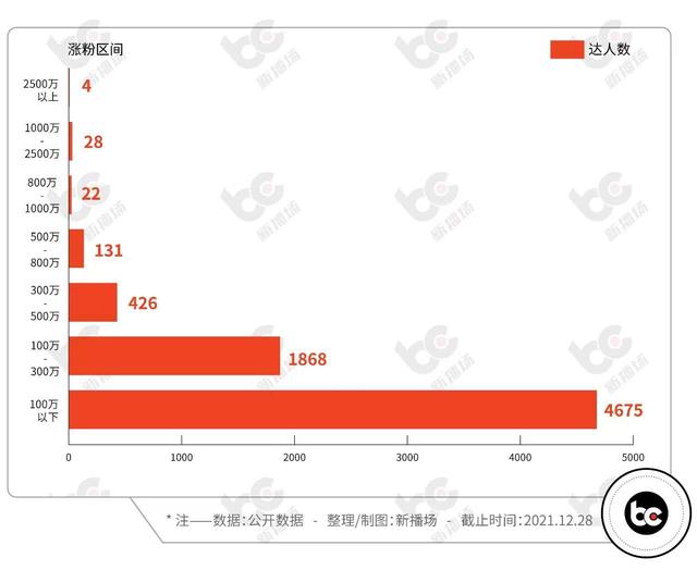 新播场统计了抖音2021年1月1日至12月28日期间15000个达人涨粉数据,有10941个账号年涨粉数在10万以上,共有83个达人账号涨粉千万以上——