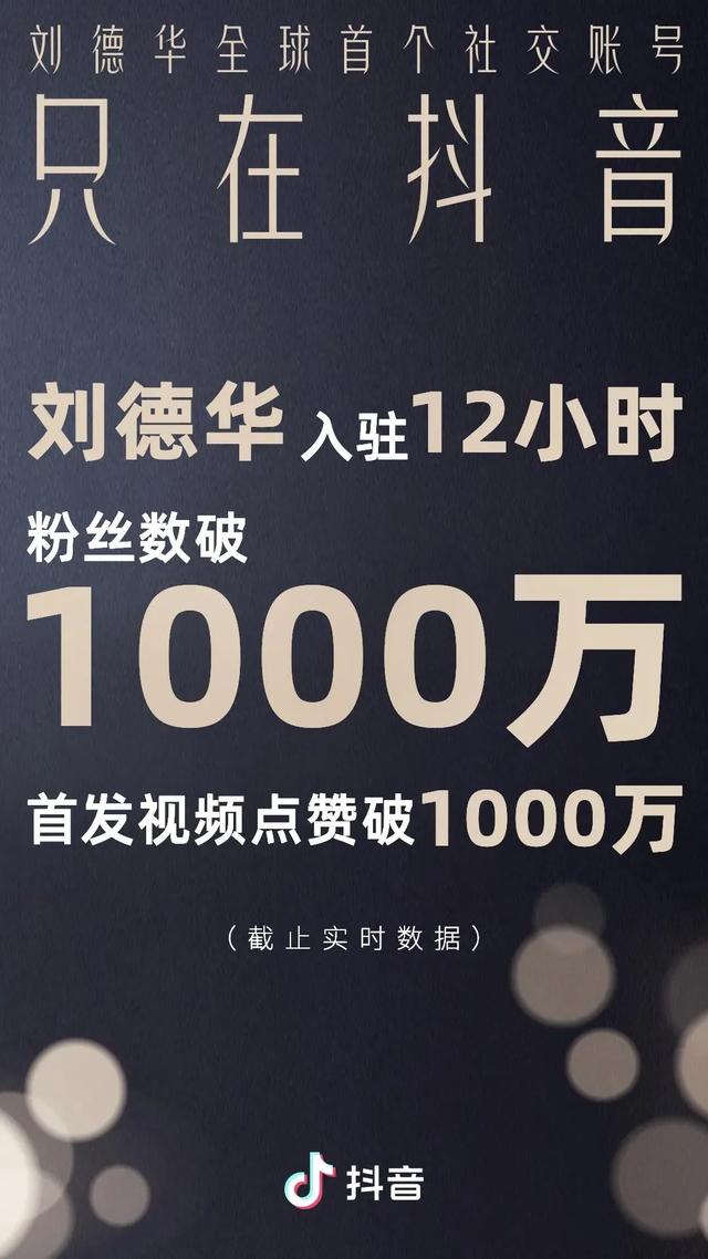 在抖音官宣消息中,刘德华抖音账号的粉丝量仅用12个小时就突破了1000万,创下个人账号涨粉记录。