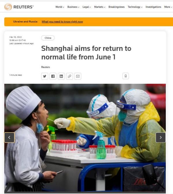 关注到,上海市副市长陈通5月15日宣布,上海自16日起会分阶段推进复商复市。报道指出,在中国,实现“社会面清零”是逐步解封、恢复常态化防控的重要前提条件。报道指出,上海单日新增病例数正在下降,上海目前的目标是在5月中旬实现社会面清零。《华尔街日报》