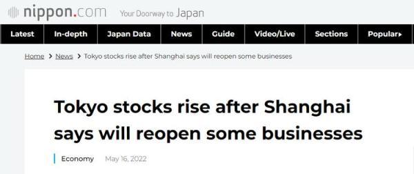 报道称,在上海宣布分阶段推进复商复市后,日本东京股市开盘大幅上涨。报道表示,这反映出作为中国的经济中心,上海宣布将复商复市后,投资者的心态有所改善。在听到这一振奋人心的好消息后,许多海外网友也纷纷通过社交平台表示祝贺,并点赞中国的防疫工作。