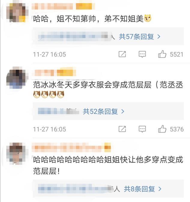 网友对于范冰冰的转发很是激动,纷纷在评论区留言,有网友感叹:"姐不知弟帅,弟不知姐美",有网友更是因"范丞丞被冻成范冰冰"语出金句,调侃称:"范冰冰多穿衣服会变成范层层",引人发笑。