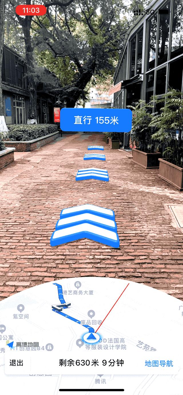 在使用《高德地图》导航时,只需举起手机,就可以进入 AR 实景模式,直接在现实场景中指示方向。