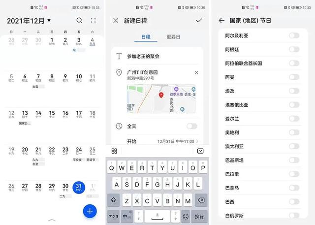 华为手机的日历,可以添加提醒、显示各个国家的节日,还能设置节假休班信息。