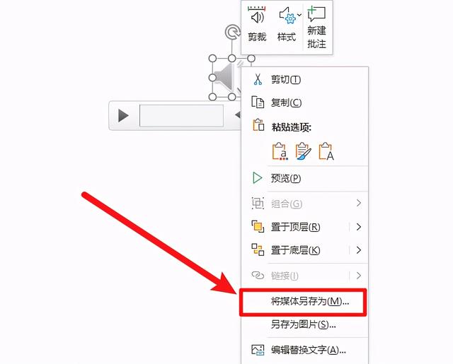 6、返回到之前的PPT页面,在音频文件上面右键单击,选择“将媒体另存为”: