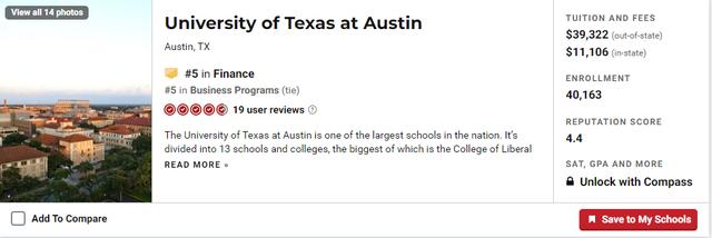 的学校包括:US.News排名16的莱斯大学,排名42的得克萨斯大学奥斯汀分校