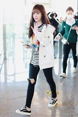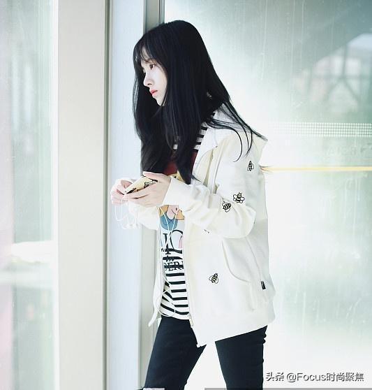 只见她上身穿一件白色外套内搭卡通条纹T恤,下身搭配一款黑色破洞铅笔裤脚踩黑白双色休闲鞋。挥手告别粉丝。呆萌气满满,温柔似水,小编已经被圈粉了。