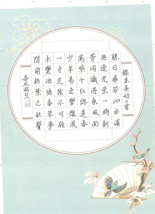 昭然是十一中七年十四班学生,从小就跟我练字,他很聪明,但也很爱淘气,开始练字并不顺利,也不太感兴趣,经过几年的磨炼,他突然觉得写一手好字是那么的赏心悦目!经过努力就有了不小的收获。他的硬笔书法作品曾获阜新市电视书法大赛“二等奖”;建党100周年全国书画大赛硬笔书法“金奖”。由于硬笔书法成绩突出,他已被阜新市文联硬笔书法家协会吸收为会员。