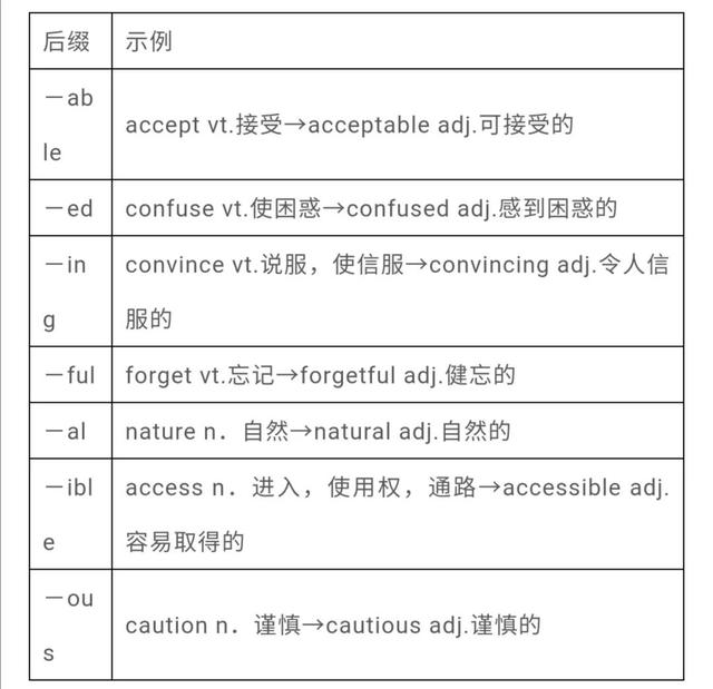 常见的动词、名词变形容词的后缀有-able,-al,-ful,-ed,-ing,-ible,-ive,-ous,-some,-y,-ern,-ish等。