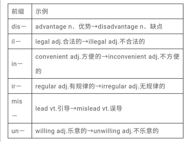 常见的表示否定或相反意义的前缀和后缀有dis-,il-,im-,in-,ir-,mis-,un-,-less等。