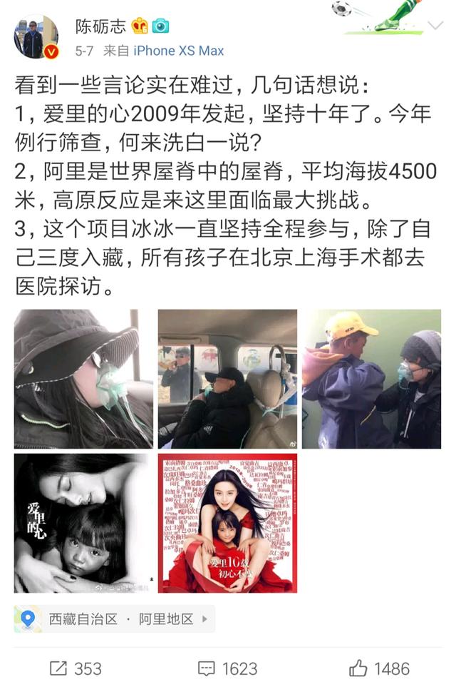 在范冰冰被人质疑的时候,微博上的红人大V陈砺志,发微博力挺,说范冰冰已经为这个公益项目坚持了十年,并没有什么洗白之说。