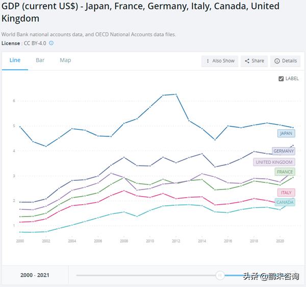 按照美元计算,2008年仿佛成为了西方国家的分水岭,G7的非美国家中,截至2021年,除了加拿大和德国保持了近3%的不错增长,英法意日基本0增长甚至负增长。如图所示。美国的盟国纷纷失去了增长的动能,日本已经“失去”近30年,英法意也“失去”了快15年了。这个有点出乎意料,却是事实。改革开放之初,