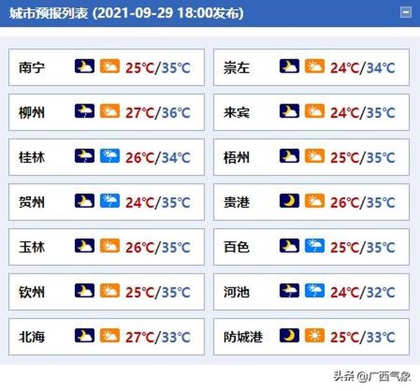 南宁市气象台预计,9月30日白天,晴到多云,气温25~35℃,偏南风1~2级。
