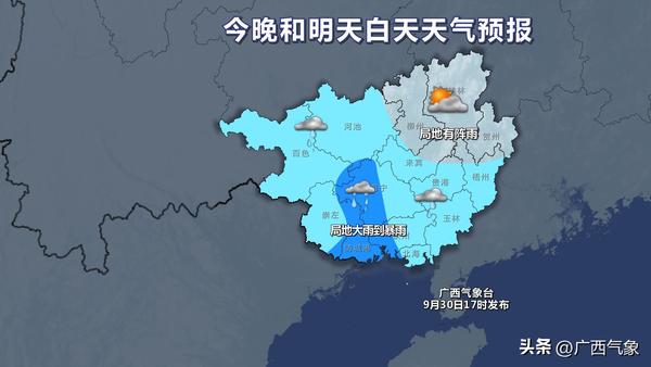 南宁市气象台预计,9月30日白天,阴天有小雨,局地中雨,25~29℃,东南风1至2级,阵风5至6级。m.nnwb.nnnews.net/p/98406.html