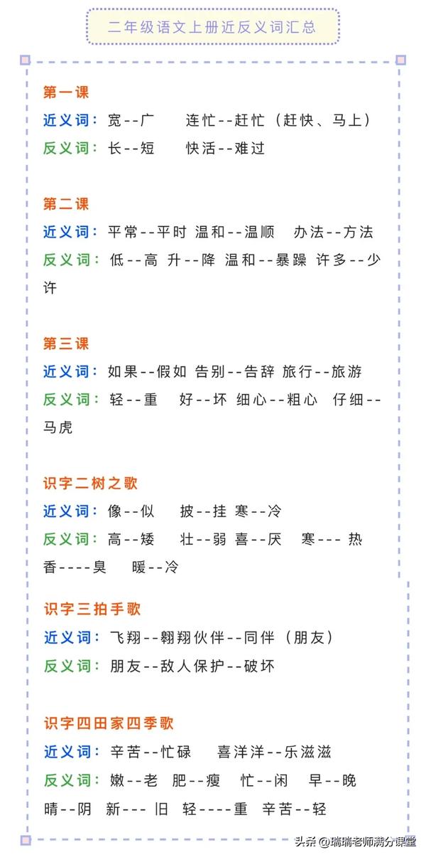 小学语文,二年级上册近反义词汇总,替孩子收藏,每天读一读记一记 u0026