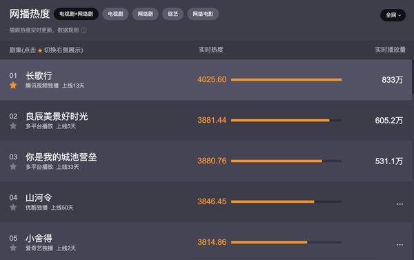 猫眼实时热度前十的电视剧,你喜欢那部?1.《长歌行》,豆瓣评分6.3上线13天,累计播放量7.99亿,豆瓣评论人数11.7万,热搜天天上!2.《良辰美景好时光》上线5天,无豆瓣评分,爱情喜剧。3.《你是我的城池营垒》,豆瓣评分7.8我第二喜欢的剧,非常接地气的甜蜜,剧情超舒爽,没看过