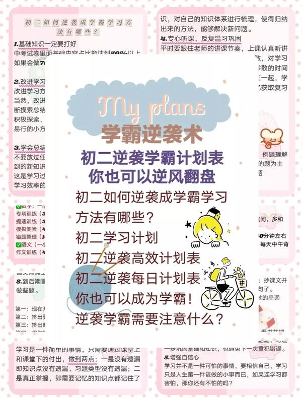 初二学霸逆袭术,高效计划表及学霸注意事项!!??初二逆袭学霸学习方法:1.基础知识一定要打好;2.改进学习方法、考试方法;3.学会总结知识,明确战略;4.专心听课,反复温习巩固。??初二学习计划(参考):周一至周五学习方案,周日学习方案!初二逆袭高效计划表!!1.作息计划表;