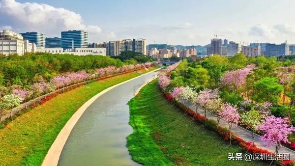 阳春三月,光明大道旁的鹅颈水沿线,两岸宫粉紫荆与勒杜鹃灿烂绽放。片片红粉色花海沿着河岸铺展开来。沿着鹅颈水沿线,在光明大道与东长路交汇处还有美轮美奂的鹅颈水湿地公园值得打卡游玩。