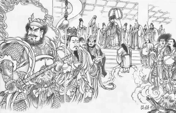 玉帝手下的天兵天将中到底有哪些能打得过孙悟空呢?本图中,观音当着玉帝的面让自己的大徒弟惠岸行者,也就是李天王的二太子木吒前往应战,结果也是大败而归。不过,玉帝手下其实有许多精兵强将并未出手,就在这幅图里,几乎都是清一色的高手,他们基本上都能打赢孙悟空。左首第一位是王灵官,乃佑圣真君佐使,道教护法